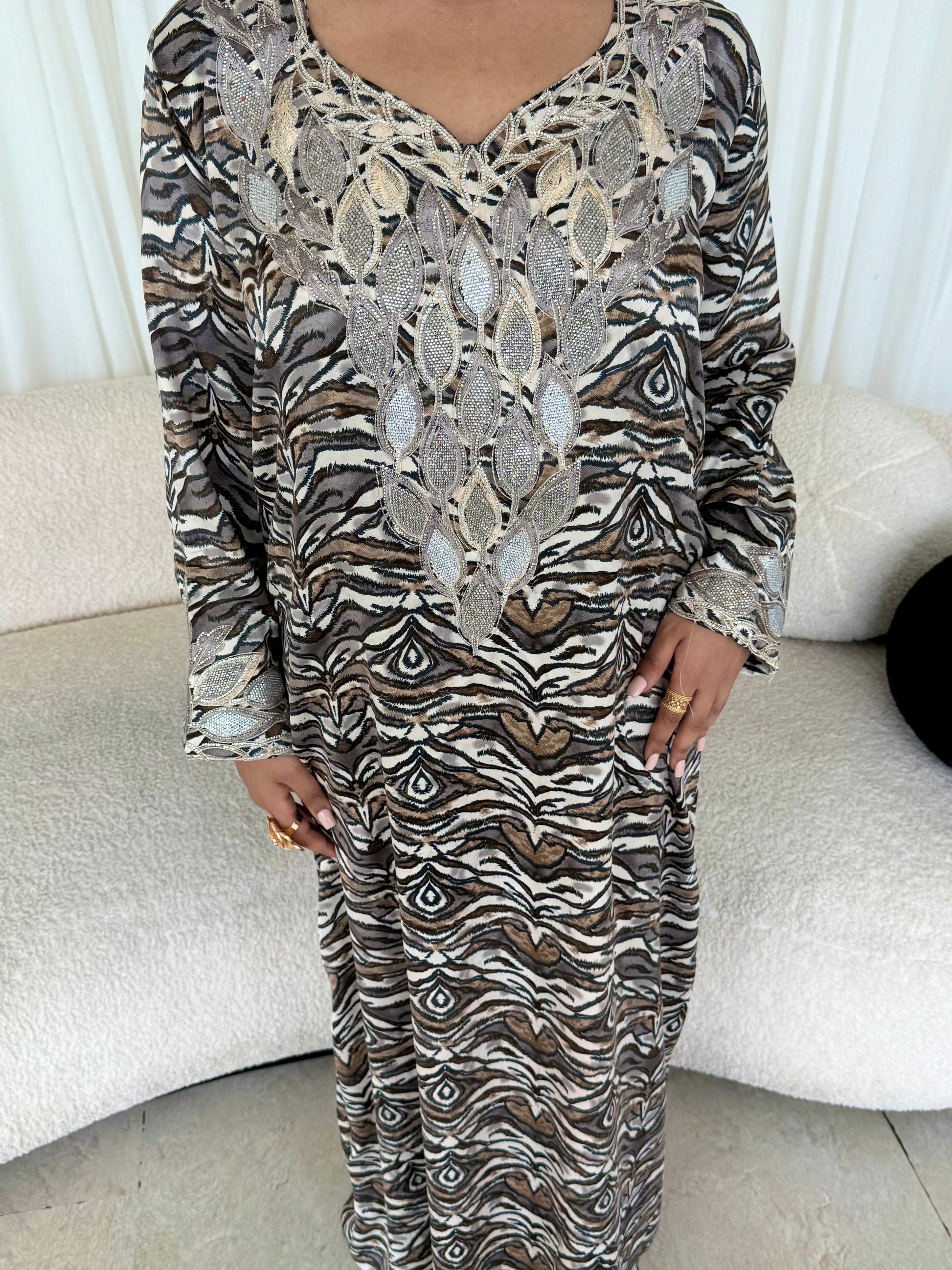 Luxurious animal print mkhawar with intricate silver embroidery for a elegant look, perfect for occasions offering a blend of comfort, modesty and timeless style.