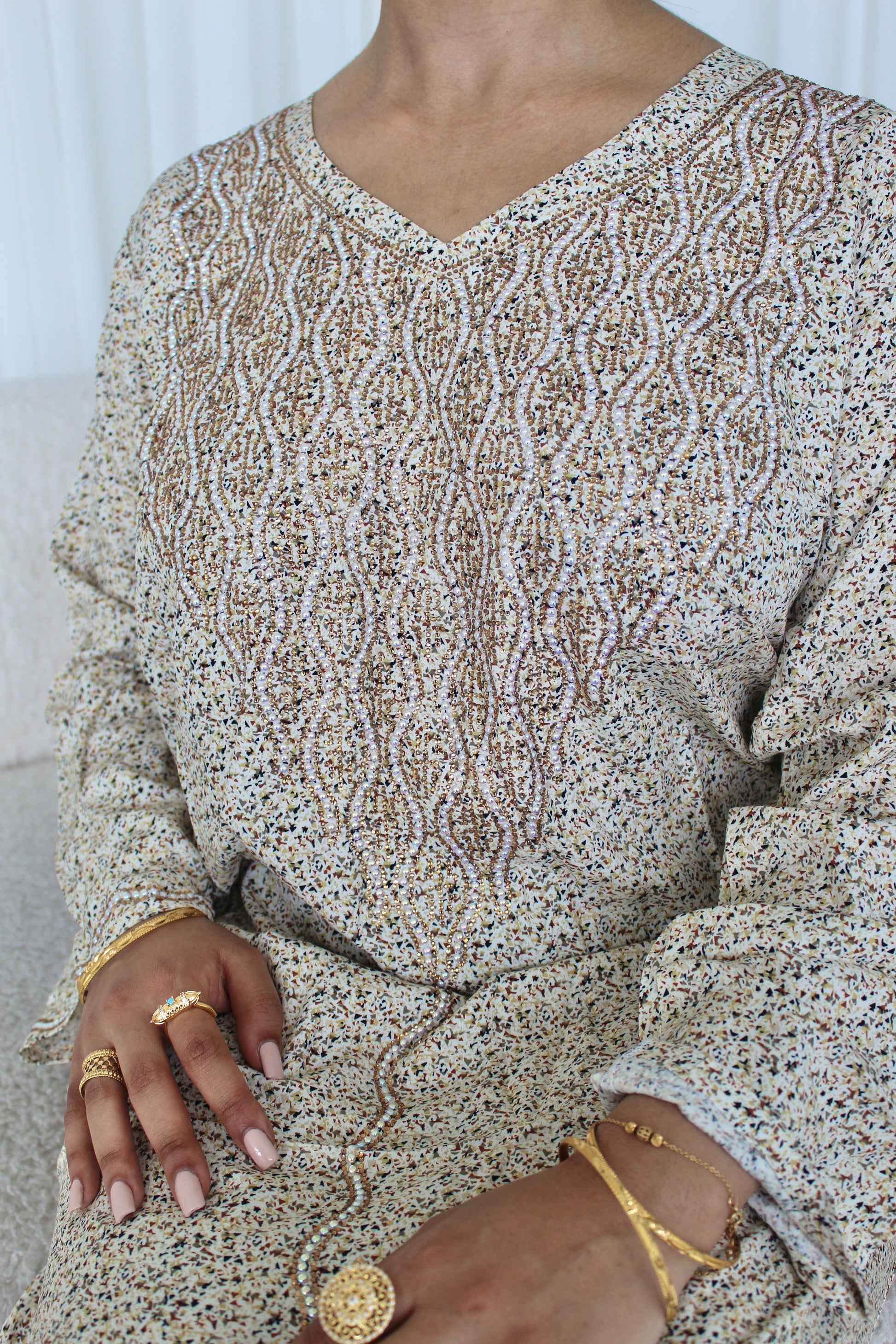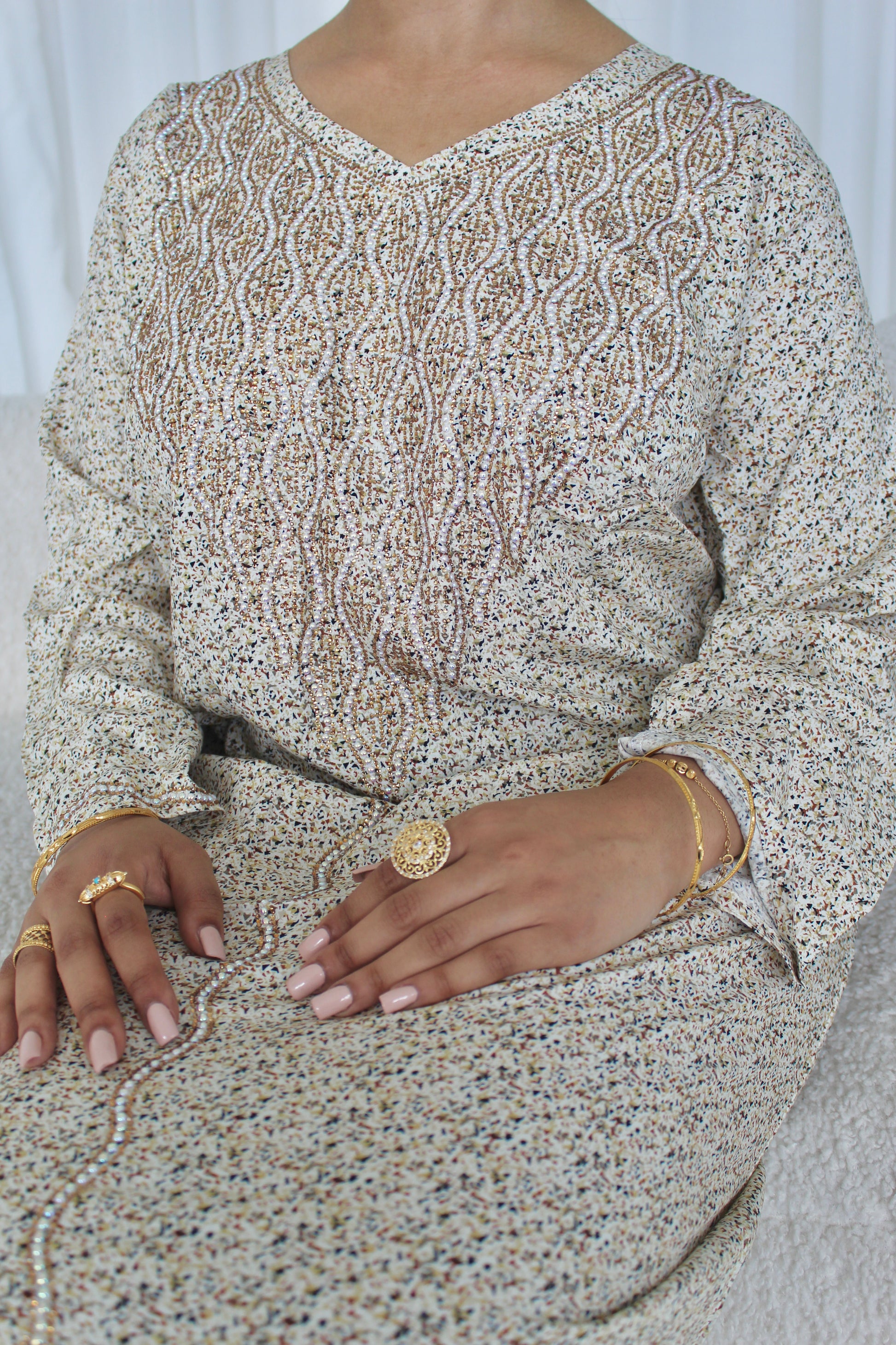 A soft neutral toned mkhawar, featuring delicate pearl touches along the dress. A versatile piece that can be worn casual or styled for evening wear.
